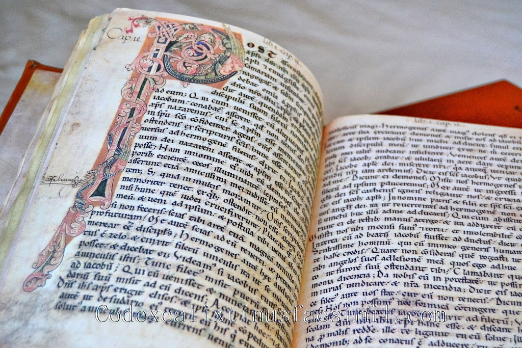 La experiencia de tener un facsímil del Códice Calixtino entre las manos es difícil de explicar. Uno sabe que no es el original y que está ante un libro que se ha elaborado mezclando los más artesanales métodos de producción y la tecnología más moderna en reproducción digital, pero no sabes porque te sigues poniendo nervioso al tenerlo tan cerca. Dicen que el Codex Calixtinus está rodeado de un halo de misterio desde tiempos inmemoriales, todavía se hace increíble que haya llegado hasta nuestros días en ese estado de conservación. Es verdad que lamentablemente lo han sustraído y que eso nos provoca cierta inquietud ante el desconocimiento de su paradero, pero también es verdad que esa leyenda que le ronda de su capacidad mágica para perdurar a lo largo del tiempo nos da esa tranquilidad de que todo va a ir bien. Como la tranquilidad que da tener un facsímil presidiendo tu casa, esa seguridad que sabes que el Códice comparte contigo y que te protege a lo largo de tu caminar por la vida. Es verdad que nada de esto es científico, pero al que tiene un facsímil en la mano nadie le puede negar la sensación que produce. Aquí tenéis estas imágenes para que podáis disfrutar de su maravillosa escritura carolingia y sus miniaturas policromáticas.